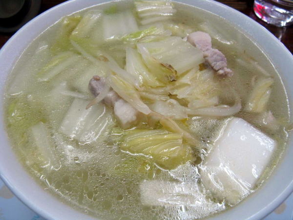スープはやや濁りを伴ったタイプで、ガラのダシが強めに効いています。それに加えてショウガが香り、白菜の甘味もバランスが絶妙となっています。スープ自体の塩味はかなり薄いのですが、油分多少強めになっているのも特徴です。